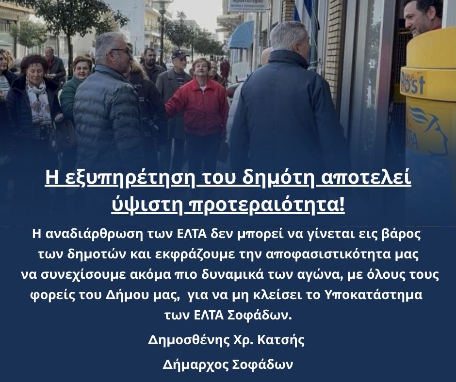 Στο πλαίσιο των αλλαγών που προωθούνται στα ΕΛΤΑ, βασική μας μέριμνα παραμένει η απρόσκοπτη εξυπηρέτηση των δημοτών. Ο Δήμος Σοφάδων, σε συνεργασία με όλους τους αρμόδιους φορείς, θα συνεχίσει να καταβάλει κάθε δυνατή προσπάθεια ώστε να διασφαλιστεί η εύρυθμη λειτουργία του Υποκαταστήματος ΕΛΤΑ Σοφάδων προς όφελος της τοπικής κοινωνίας.