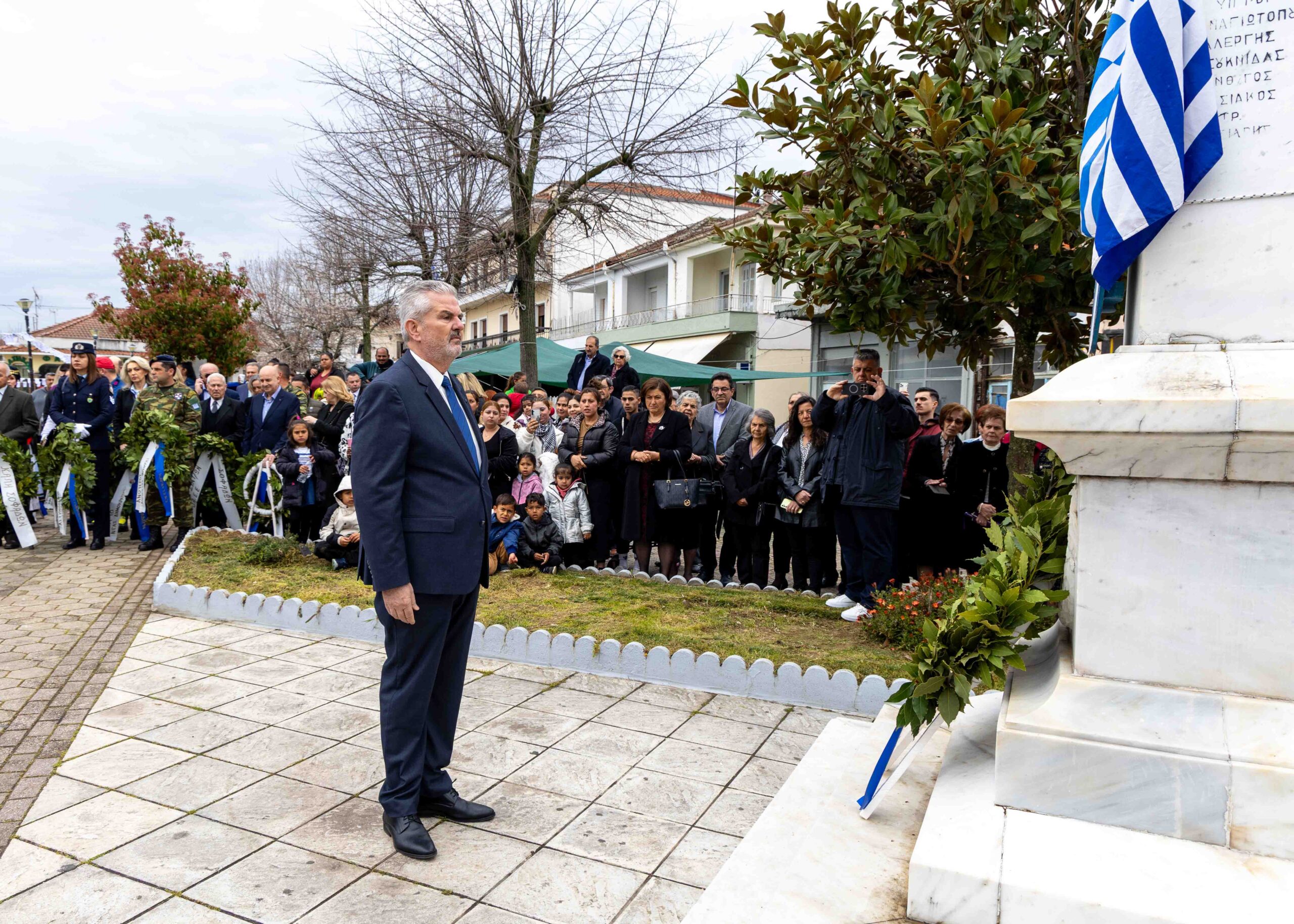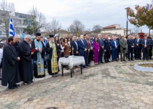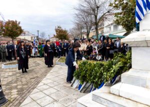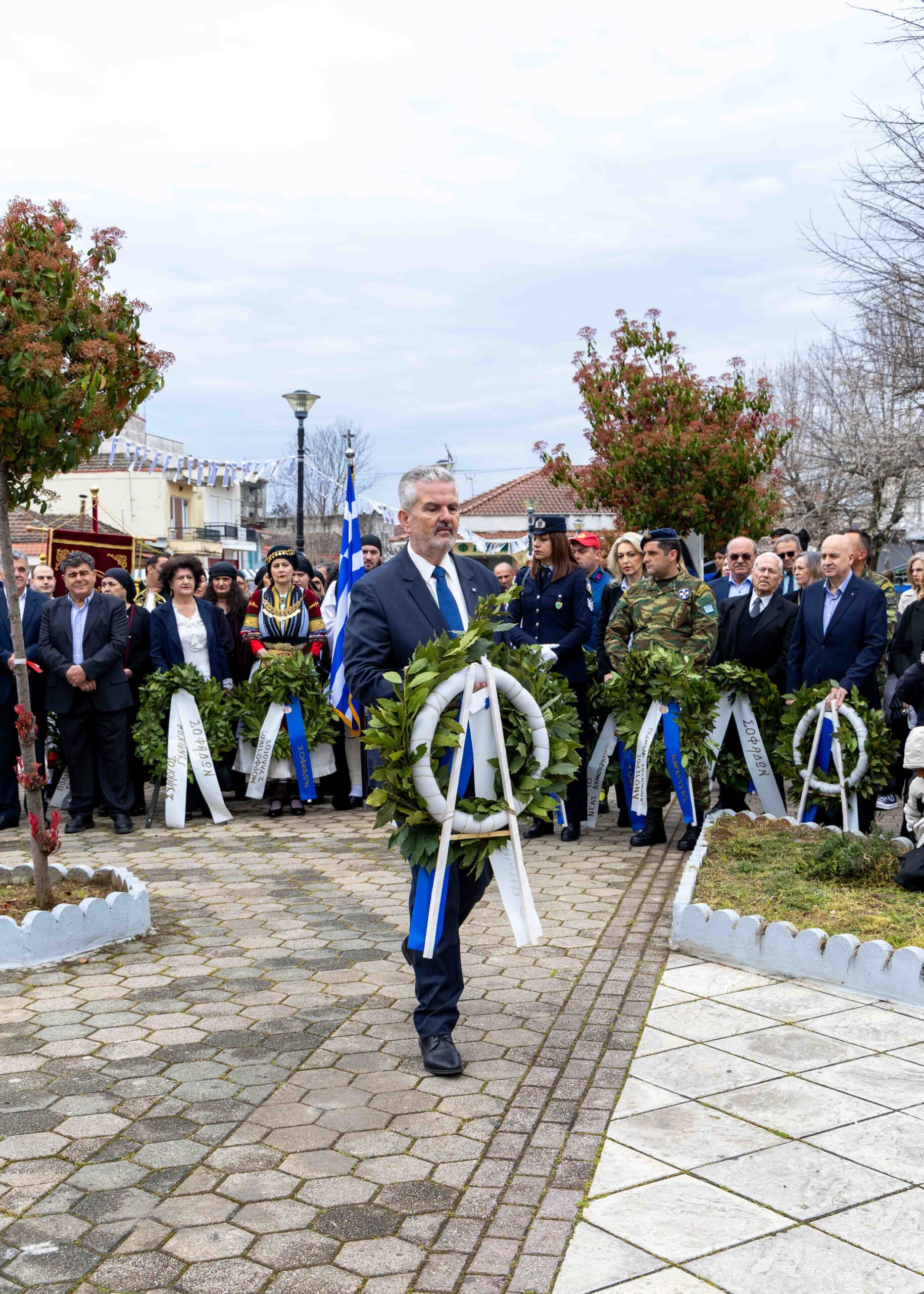 Στη συνέχεια πραγματοποιήθηκε επιμνημόσυνη δέηση στο Μνημείο Ηρώων στην Κεντρική Πλατεία, όπου ακολούθησε η κατάθεση στεφάνων από τον Δήμαρχο Σοφάδων κ. Δημοσθένη Κατσή, την εκπρόσωπο της Περιφέρειας Θεσσαλίας κ. Σοφία Κατέβα, τους διοικητές του Αστυνομικού Τμήματος και της Πυροσβεστικής Υπηρεσίας Σοφάδων, καθώς και από εκπροσώπους στρατιωτικών αρχών, πολιτικών κομμάτων, τοπικών συλλόγων και μαθητές των σχολείων της πόλης.