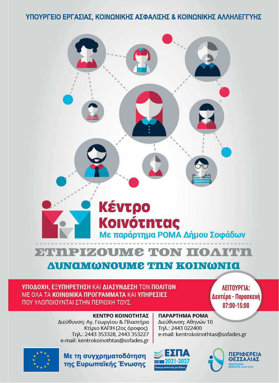 Το Κέντρο Κοινότητας με Παράρτημα Ρομά του Δήμου Σοφάδων με κωδικό πράξης MIS (ΟΠΣ) 6003271 έχει ενταχθεί στον άξονα προτεραιότητας «Δράσεις ενίσχυσης της Κοινωνικής Συνοχής και αντιμετώπισης της φτώχειας» του Ε.Π. «Περιφερειακό επιχειρησιακό πρόγραμμα Θεσσαλίας 2021-2027. Αποτελεί συνέχιση της Πράξης με κωδικό 5002786 η οποία υλοποιήθηκε από την Δημοτική Κοινωφελή Επιχείρηση του Δήμου Σοφάδων και είχε ενταχθεί στον άξονα προτεραιότητας «Ανάπτυξη και αξιοποίηση ικανοτήτων ανθρώπινου δυναμικού – ενεργός κοινωνική ενσωμάτωση» του Ε.Π. «Περιφερειακό επιχειρησιακό πρόγραμμα Θεσσαλίας 2014-2020. Η πράξη συγχρηματοδοτείται από το Ευρωπαϊκό Κοινωνικό Ταμείο.